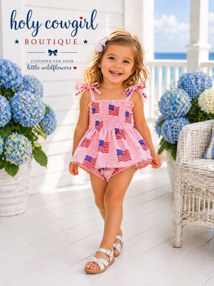 This darling little set features a soft pink smocked top adorned with delicate American flag prints, giving it the perfect blend of playful and festive. The flutter tie straps add an extra touch of sweetness, while the flowy peplum-style top pairs beautifully with the matching bloomers for a comfy, easy-to-move-in fit.