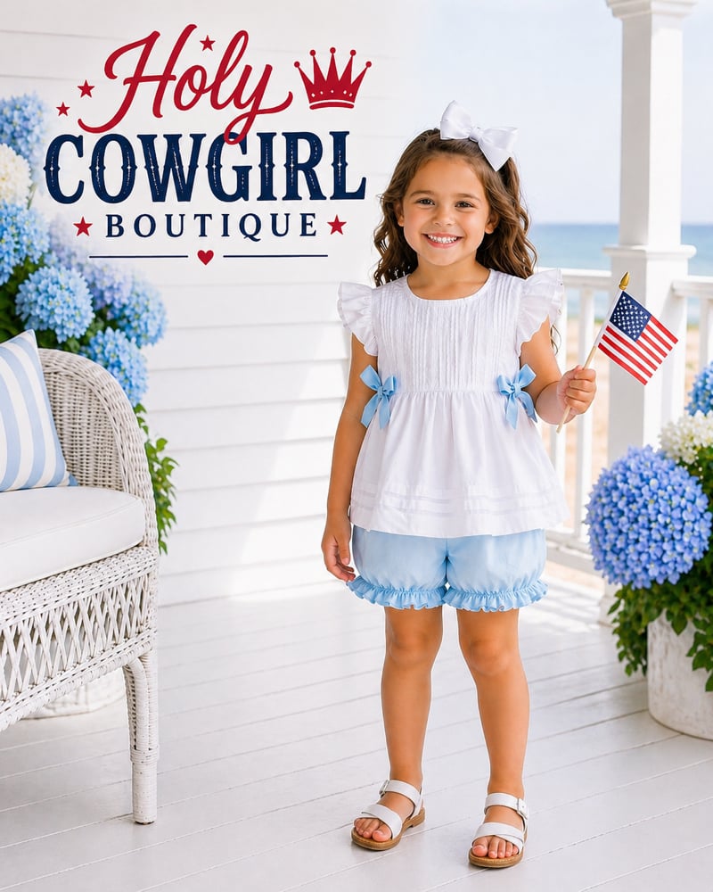Lightweight and breathable, this set keeps your little one cool and comfortable while looking picture-perfect. Whether she’s waving flags on the porch, heading to brunch, or enjoying a beachside day, this outfit brings timeless southern charm with a fresh, coastal feel.
